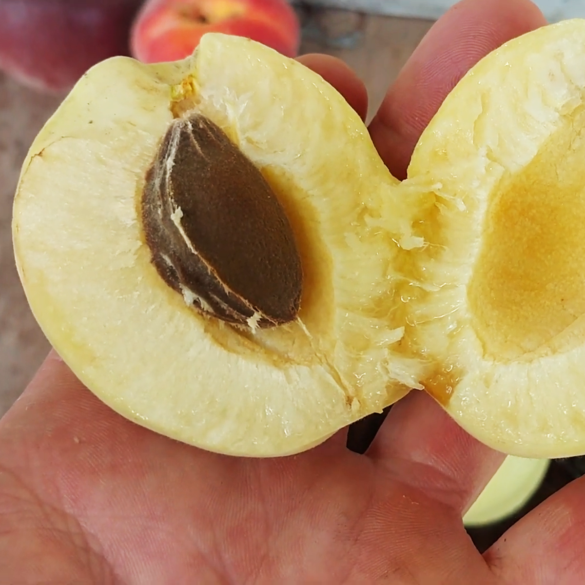 Плоди біло-жовтого відтінку подекуди з рум'янцем. Вони великі м'ясисті, з кісточкою, що легко відокремлюється.