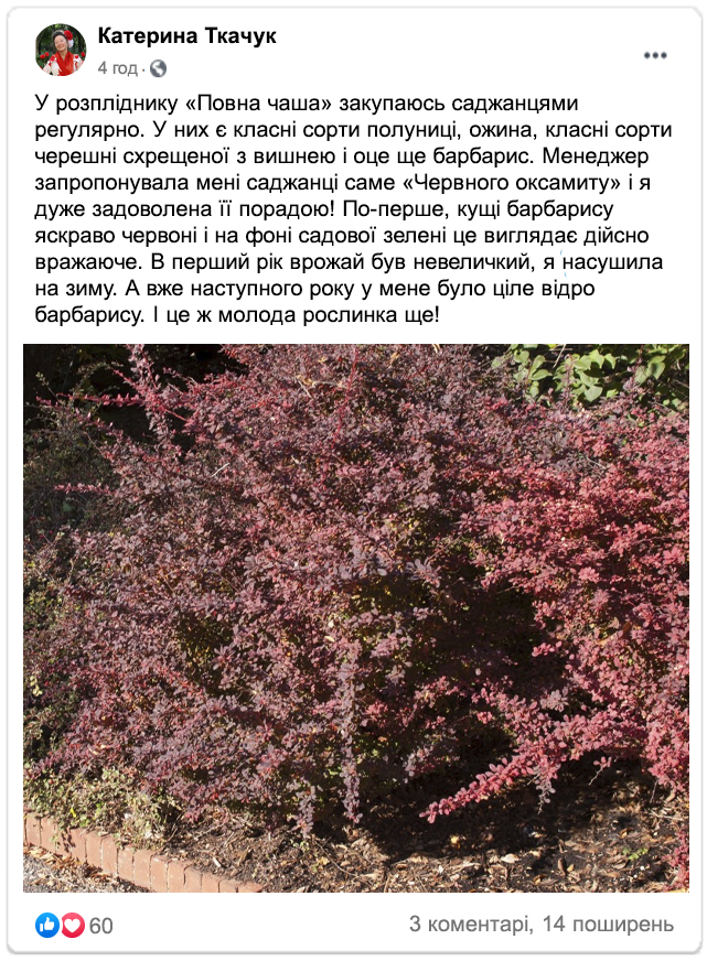 Садівники діляться відгуками на барбарис сорту «Червоний оксамит»