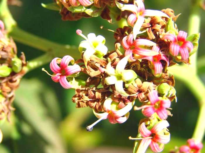 Квітки кешʼю не вважаються дуже декоративними. Вони мають невеликий розмір (8-15 мм), блідо-зелене, інколм із рожевим відтінком, забарвлення. Квітки сформовані у квітколоже з п'ятьма тонкими загостреними на кінцях пелюстками. Вони зібрані у суцвіття.