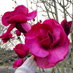 Однією з ключових переваг магнолії Джені є висока морозостійкість, завдяки чому вона прекрасно почувається навіть у прохолодному кліматі. Цвіте вже в квітні, вкриваючись великими, ефектними квітками, що за формою нагадують тюльпани. Розмір кожної квітки вражає — до 15 см у діаметрі!