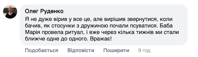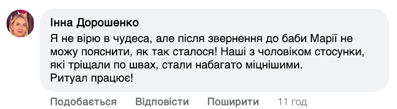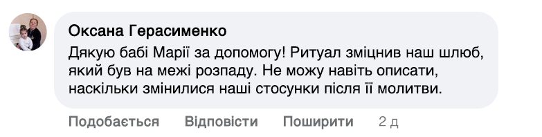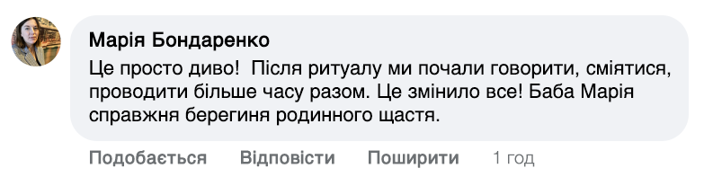 Слова мають здатність відкрити серце для кохання чи зцілити вже існуючі стосунки. Раніше до мене їхали люди з усіх кутовчків України та не тільки. Та зараз я вже старенька. Ноги та зір підводять, але бажання допомагати не зникло. Роблю все можливо, щоб якомога більше людей пізнали щастя та любов!