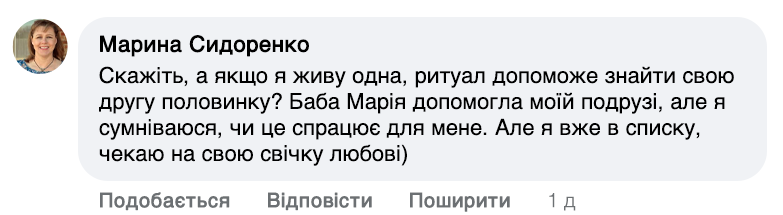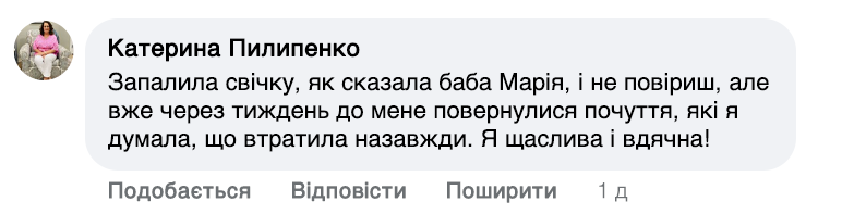 — Так, щоб молитва почала діяти, потрібна свічка, заговорена мною. А свічка то звичайна, віск та й усе. Головне— слова та молитва. Людині важливо опівночі її запалити та промовити ці слова: «Хай все станеться, як має статися, та буде — як буде. Коханням наповни мене та зціли». Тоді все й піде на лад.